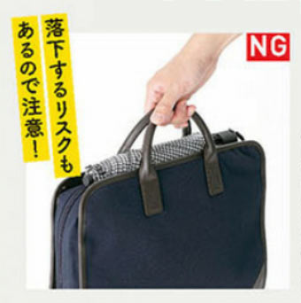 両手が空いて便利そうですが、実はビジネスシーンでは、利便性を追求すること自体がマナー的に避けるべきとされています。また、スーツの型崩れを引き起こす可能性もあるので注意が必要です。