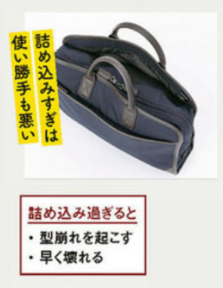 バッグにいろいろと詰め込むのは、見た目もよくない上に、バッグの型崩れを引き起こし、バッグの寿命そのものを縮めるのでやめた方がよいです。