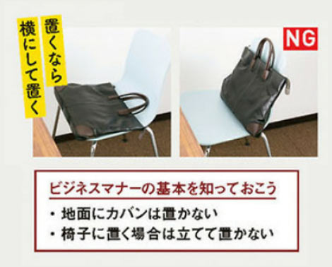 ビジネスマナー的にはNGですが、椅子に置く機会は頻繁にあるので、許容範囲ともいえます。ただし、その場合でも、カバンの底が椅子に触れないようにします。