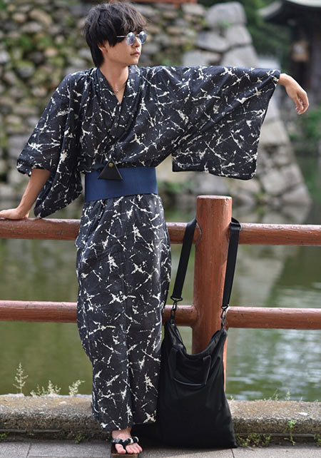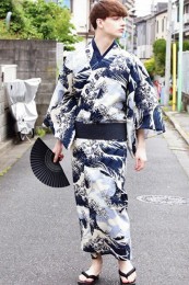 日本画のような波柄を全面にあしらったインパクト大の浴衣。素材は「肌触り・軽さ・柔らかさ」に長けた超長綿で織り上げたもの。安っぽさのない素材感でも一歩リード。