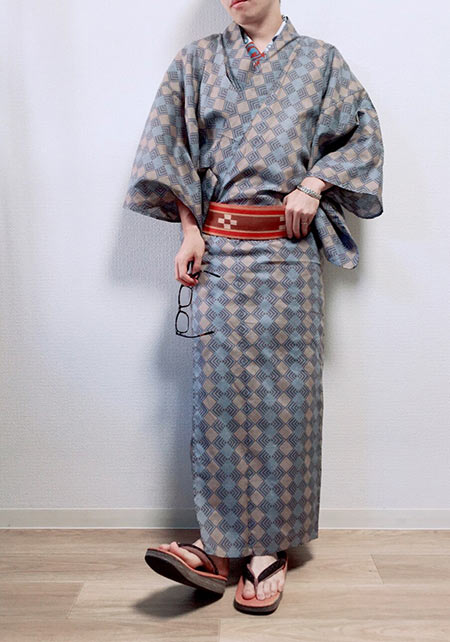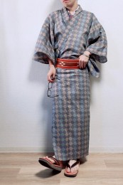 レトロな雰囲気のある「格子柄」の浴衣セット。グレー帯が絶妙なアクセントとなりつつ黒下駄が全体を引き締め、クールモダンな仕上がりに。