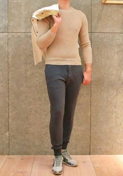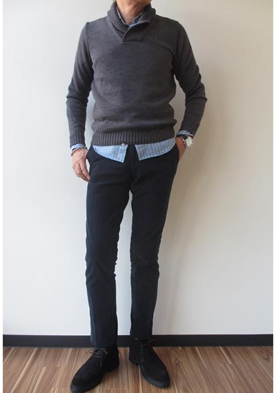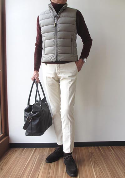 パンツはデニム・チノパンがベターで、ウール素材でもツルッとしたスラックスなら相性はいいです。