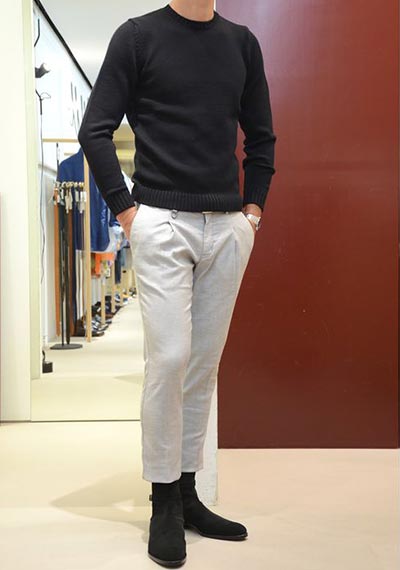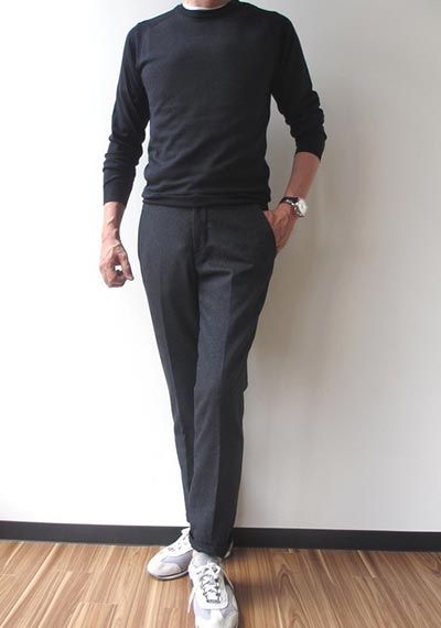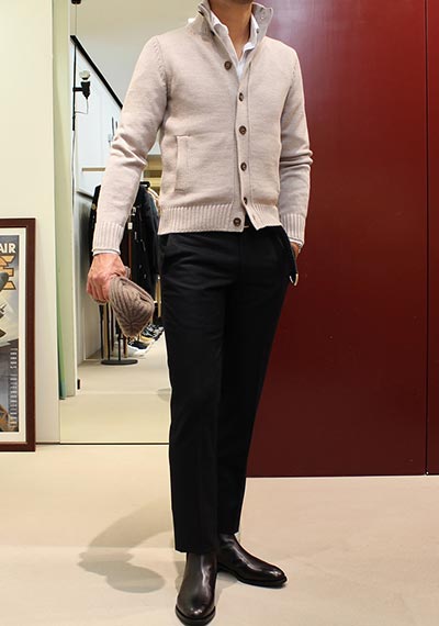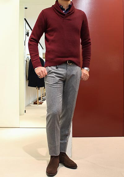 温かみのあるミドルゲージニットゆえ、パンツに起毛感のあるウールパンツを合わせると”野暮ったく”なってしまうので避けたいところ。