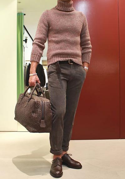 ここ最近イタオヤのトレンドとなっている「タートルネック×シャツ」の組み合わせ。