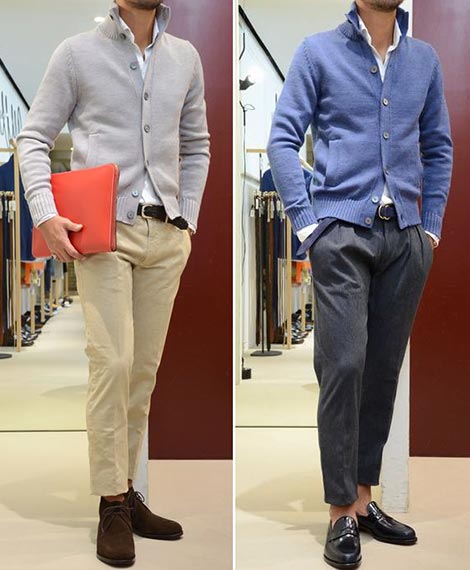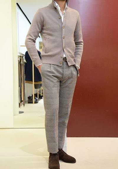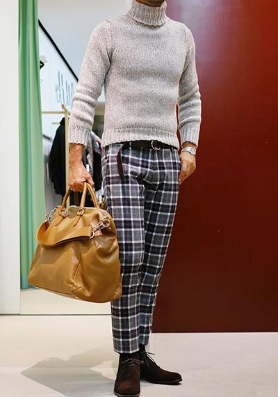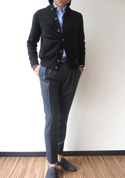 編地が滑らかでプレーンな印象があるので、ミドルゲージやローゲージに比べかなり上品で知的な印象を漂わすことが可能。同じジャケットのインナーとして使っても、ハイゲージはより洗練されたエレガントなスタイルにまとめやすい。
